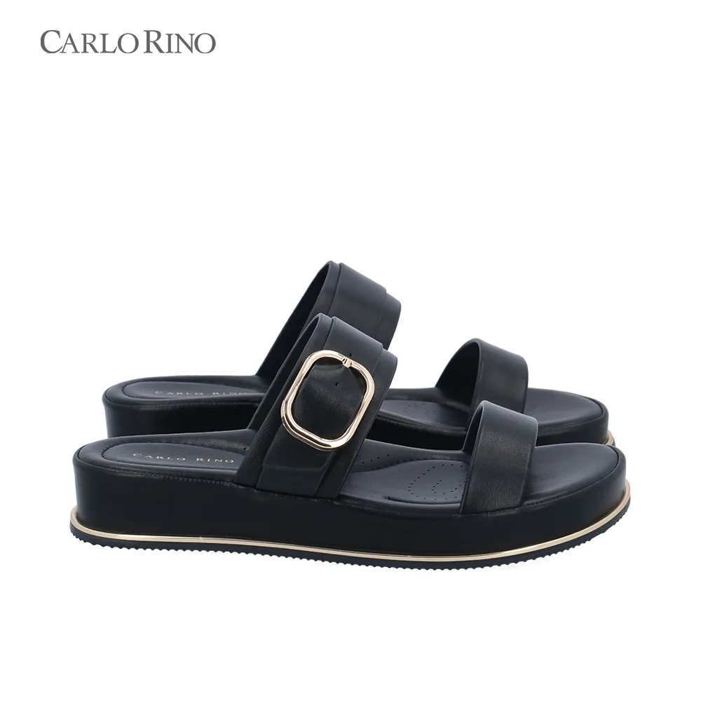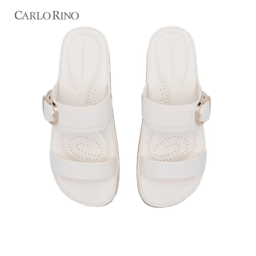 Timeless and versatile, these white and black sandals come with double straps and a gold buckle accent, paired with a cushioned insole for lasting comfort.