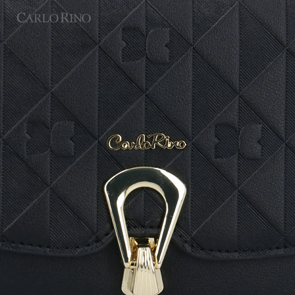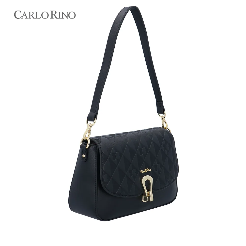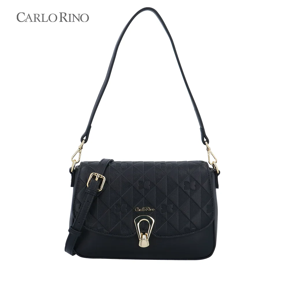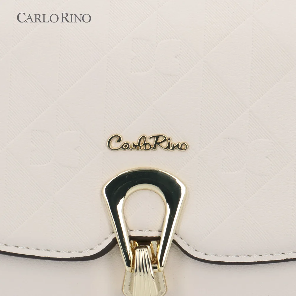 This crossbody bag blends texture and elegance with an embossed quilt pattern alternating with the signature CR monogram. Made from smooth synthetic leather, it features a sleek front flap and a metal clasp for a sophisticated finish.