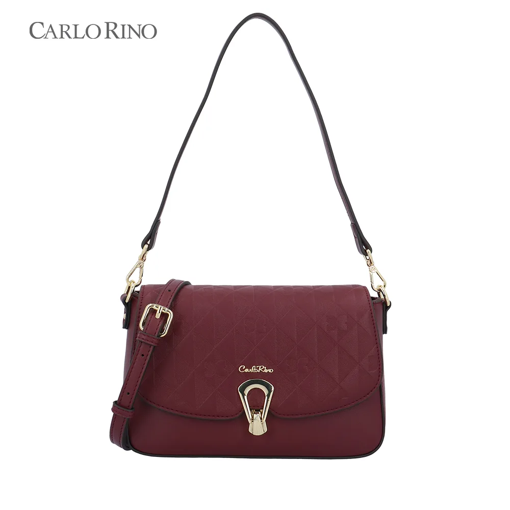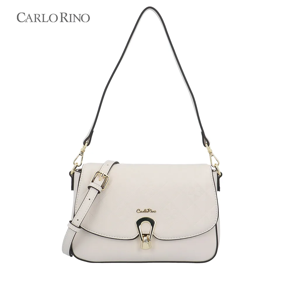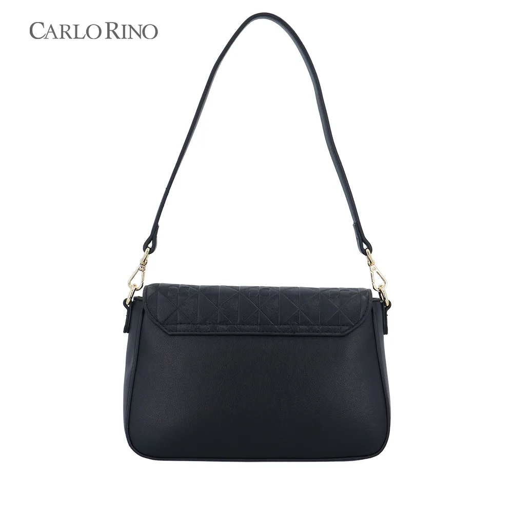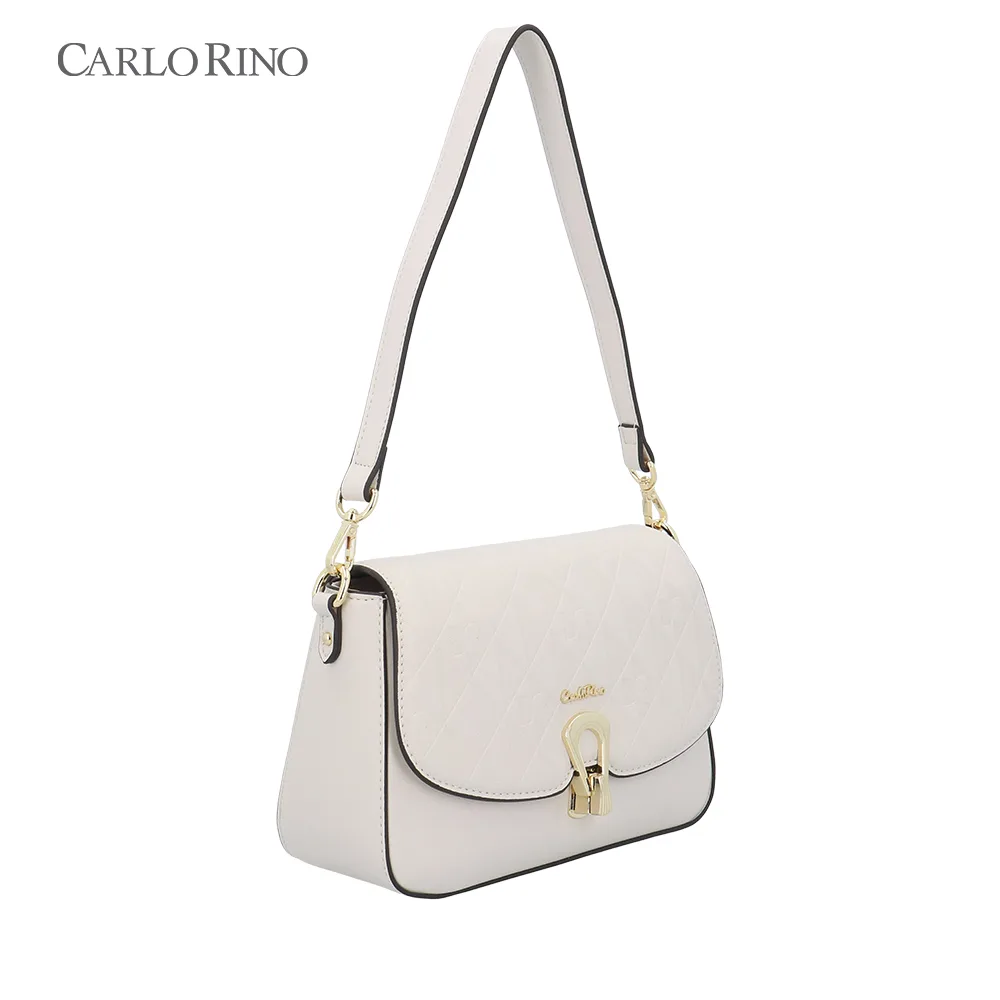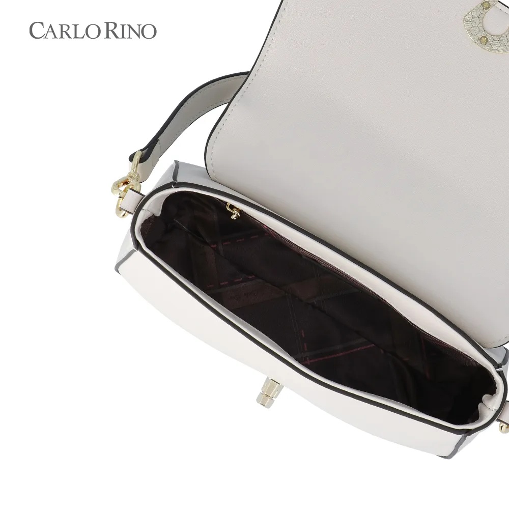 This crossbody bag blends texture and elegance with an embossed quilt pattern alternating with the signature CR monogram. Made from smooth synthetic leather, it features a sleek front flap and a metal clasp for a sophisticated finish.