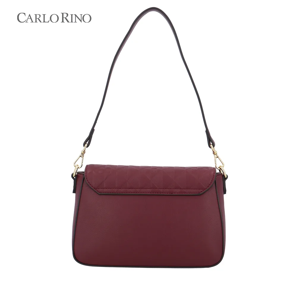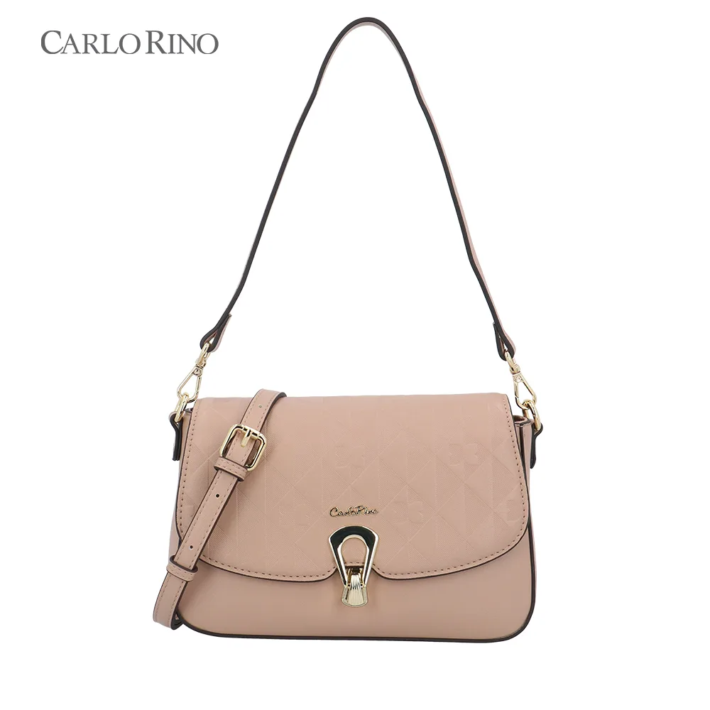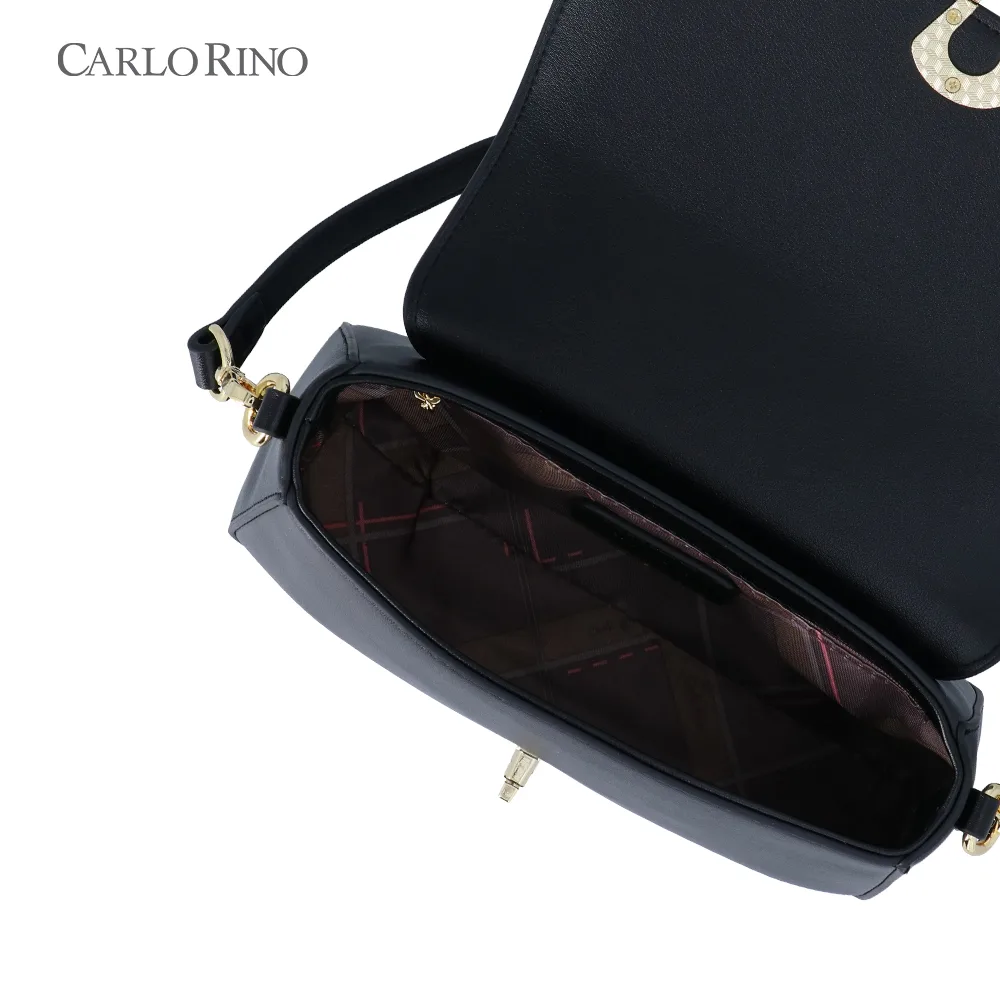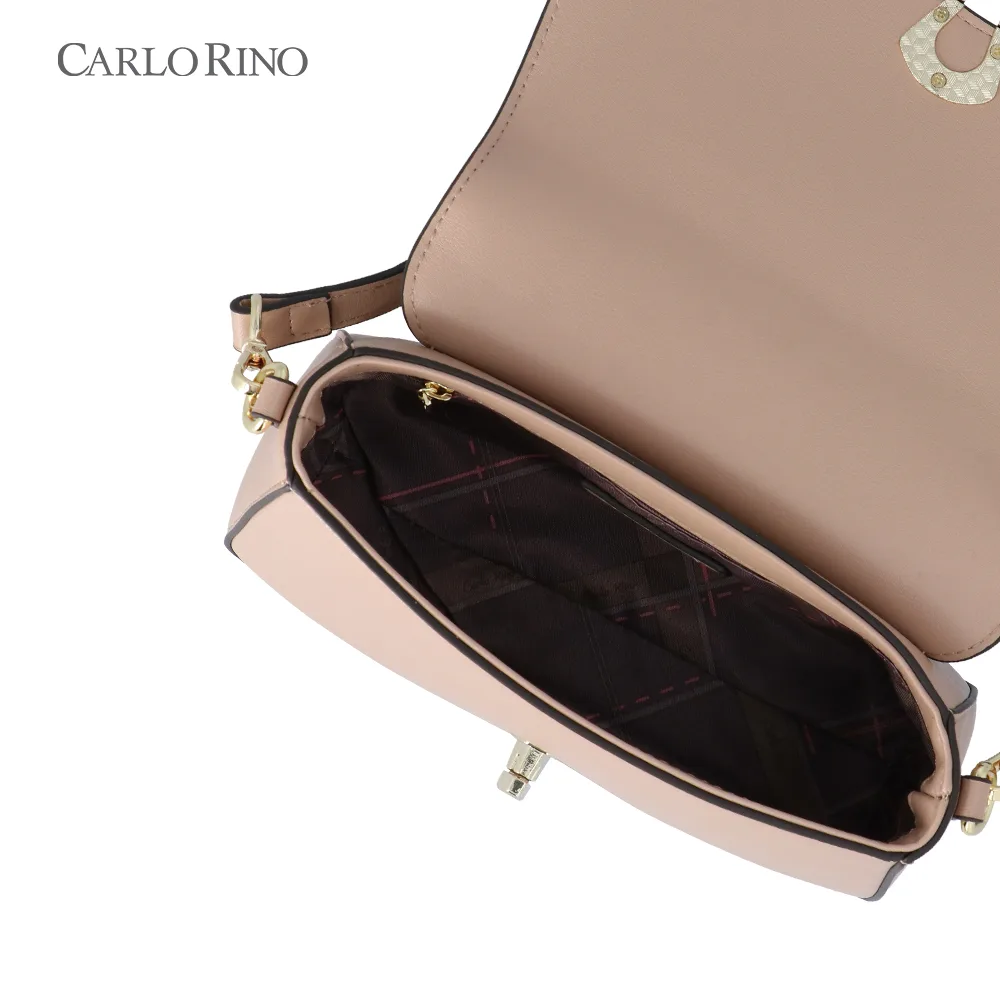 This crossbody bag blends texture and elegance with an embossed quilt pattern alternating with the signature CR monogram. Made from smooth synthetic leather, it features a sleek front flap and a metal clasp for a sophisticated finish.