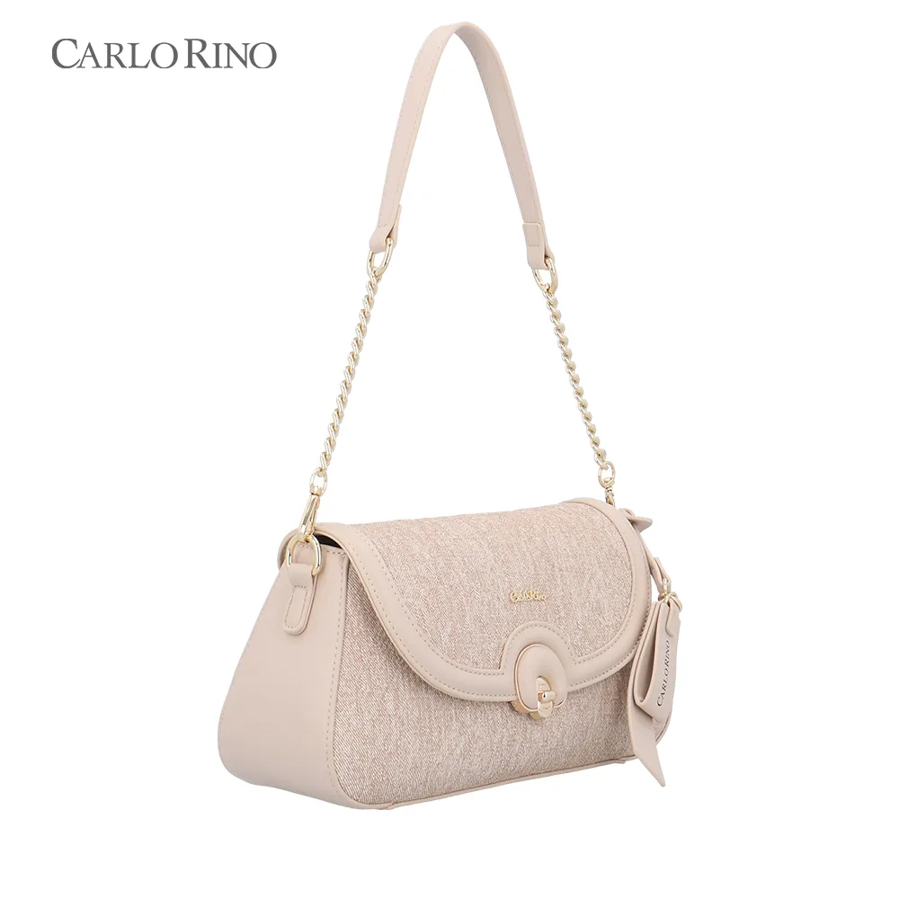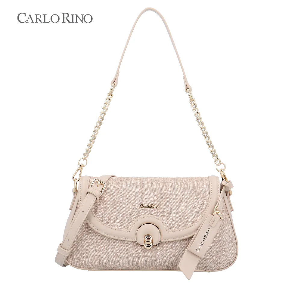 Effortlessly chic, this crossbody bag blends textures for a sophisticated finish. The flap features our embossed CR monogram in delicate beige synthetic leather, contrasted by a subtly textured body for depth and detail. A gleaming gold chain strap and matching hang tag add a touch of polish, making this bag the perfect companion for both day outings and evening occasions.