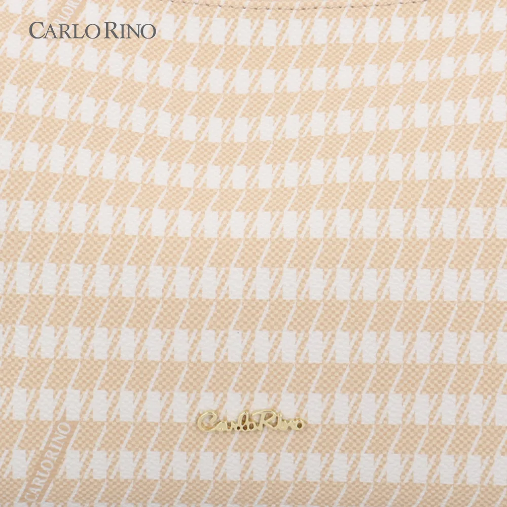 Chic and versatile, this 2-way shoulder bag features a longer canvas logogram strap for effortless shoulder or crossbody wear. Its beige-and-white houndstooth print with light brown trim adds a subtle, elegant flair.