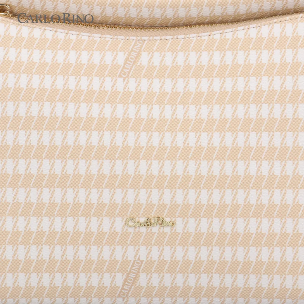 Structured and timeless, this crossbody bag in beige-and-white houndstooth coated canvas is accented with light brown trim for a polished finish. Perfect for keeping essentials close in style.
