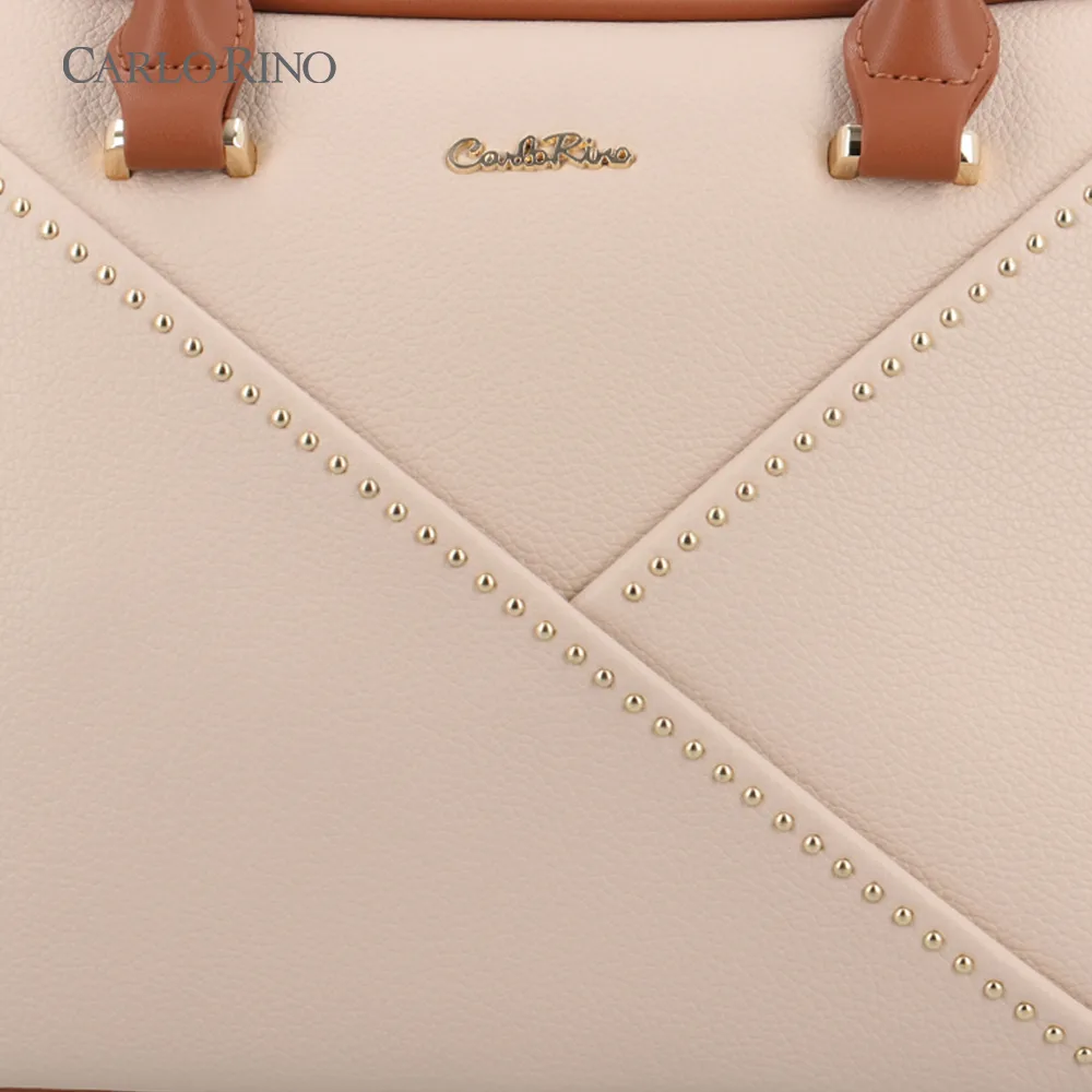 Refined and timeless, this top handle bag pairs creamy white synthetic leather with dark brown trims. Its gem-embellished criss-cross stitching also adds subtle elegance.