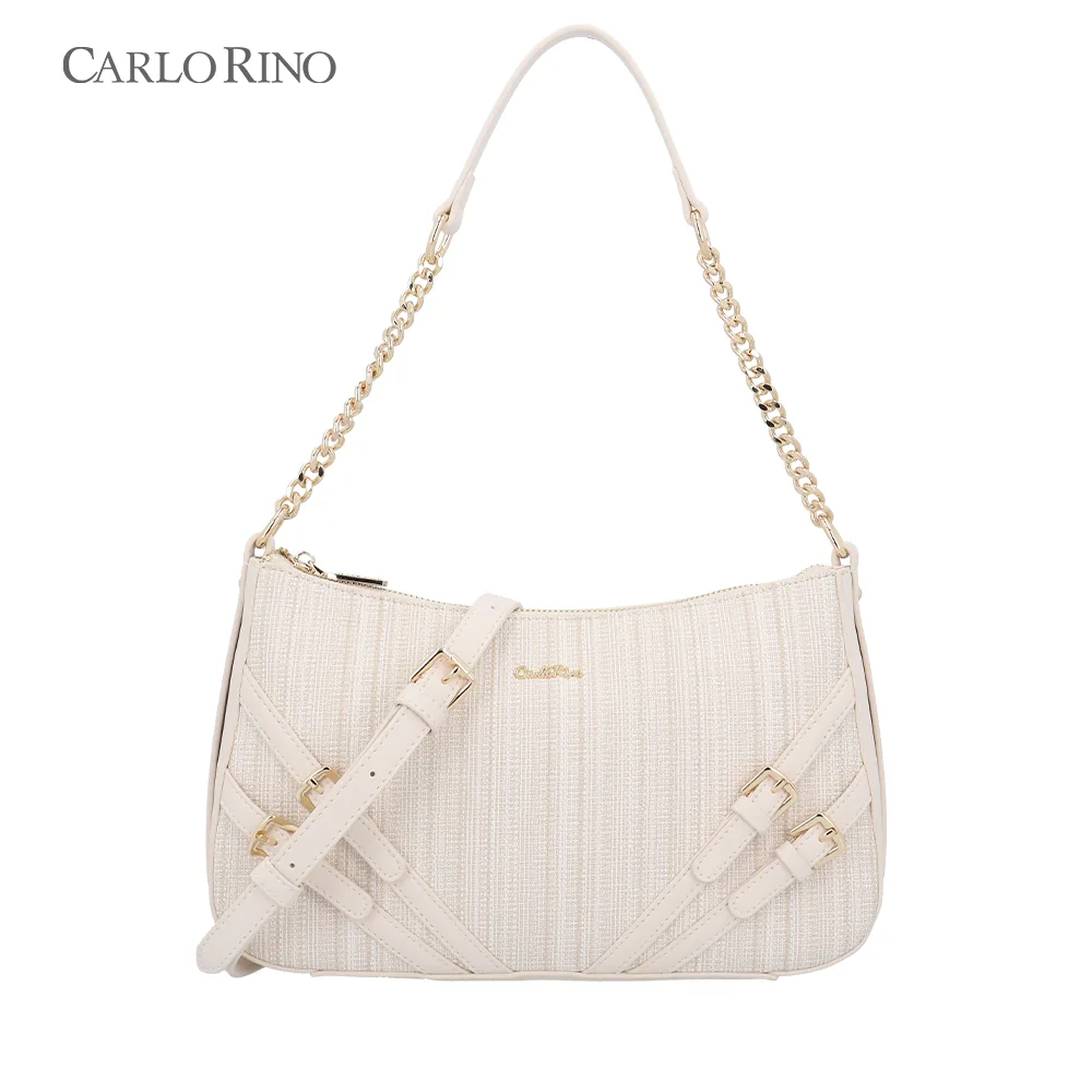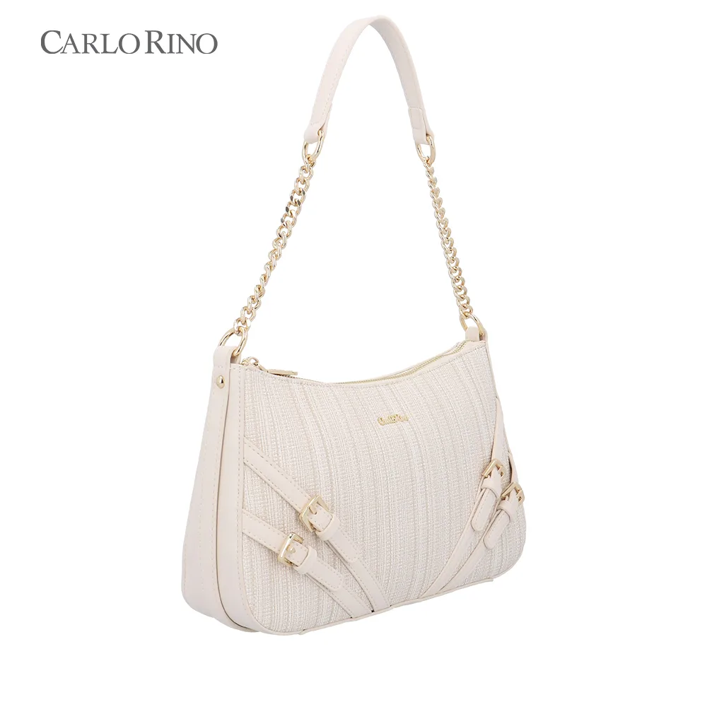 Cosy meets chic in this shoulder bag, crafted from synthetic leather in a clean beige textured finish that mimics the look of a knitted weave. Perfect for sweater-weather days, it’s detailed with two slim buckled straps at the bottom diagonals for a touch of understated flair.