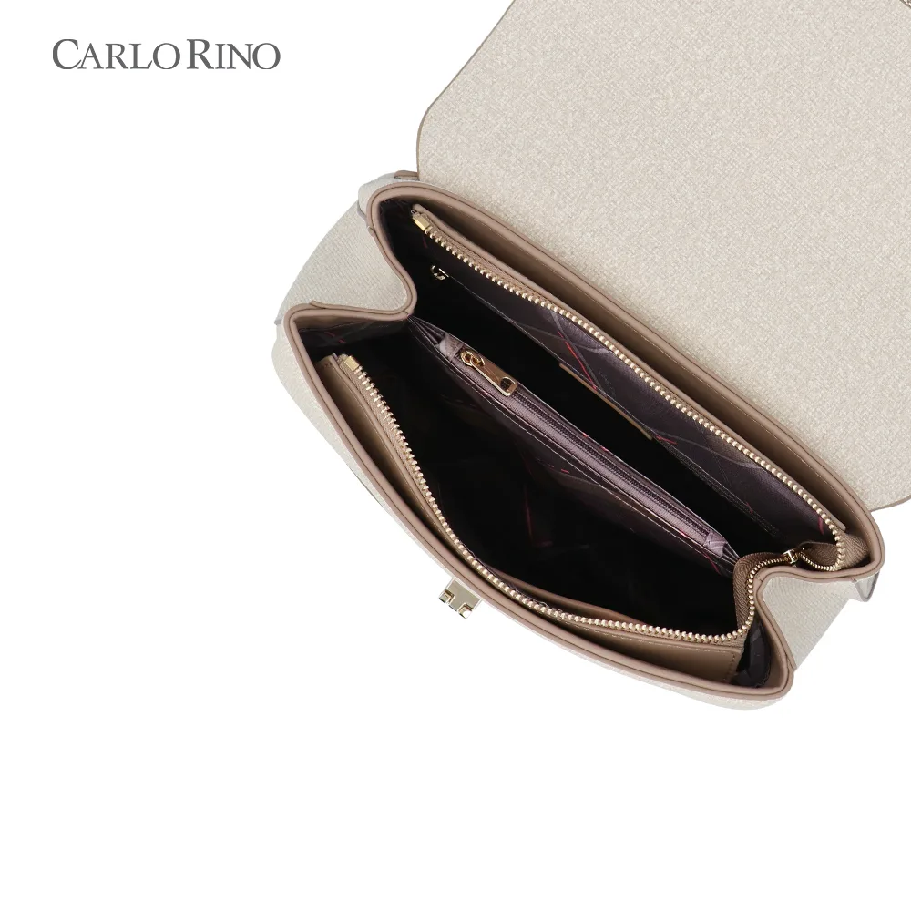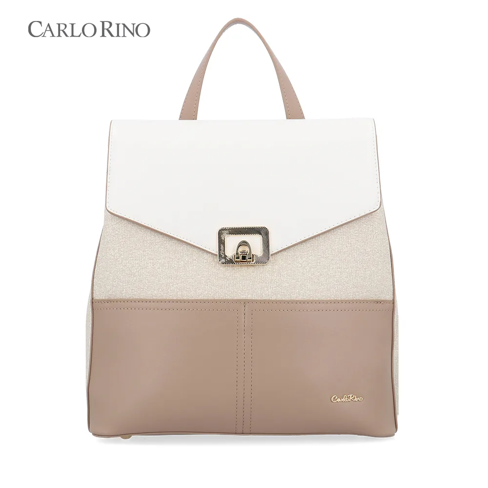 Modern and sophisticated, this synthetic leather backpack features a white flap contrasted against beige and tan tones. Finished with a gold hardware clasp closure, it’s a stylish choice for both casual and elevated outings.