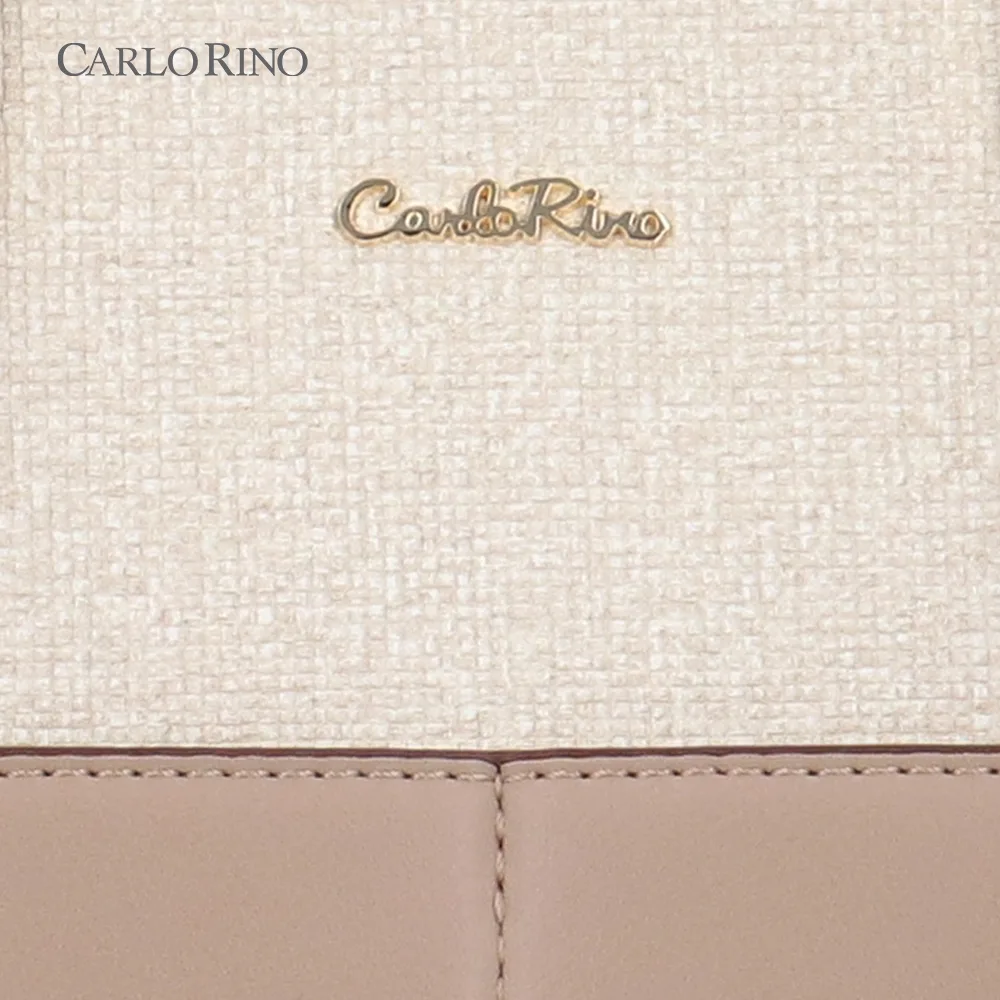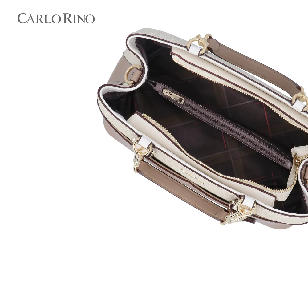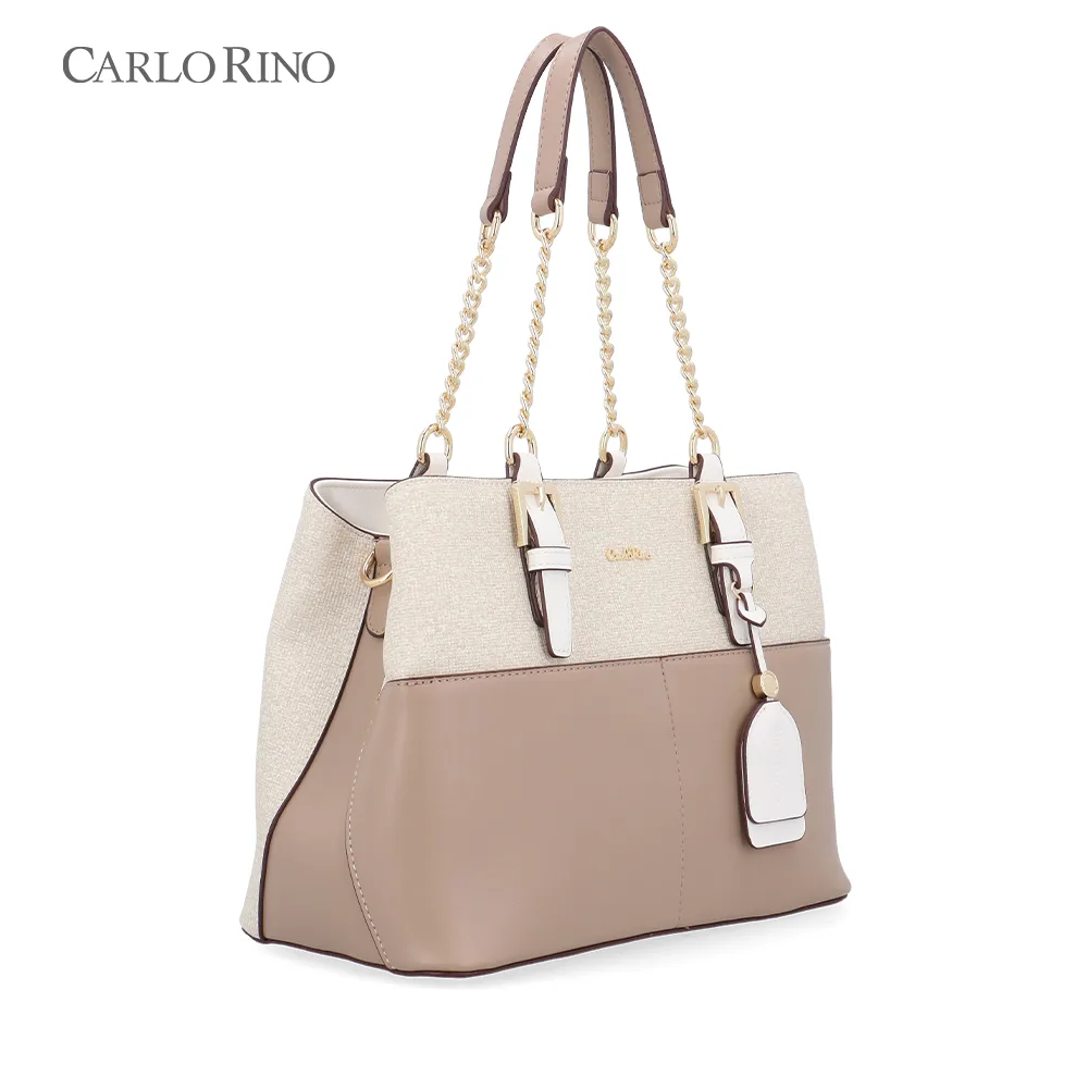 Clean and polished, this structured tote features a sharp silhouette in beige and light brown contrasting tones. Finished with a half chain strap and hangtag, it’s perfect for a sleek, put-together style.
