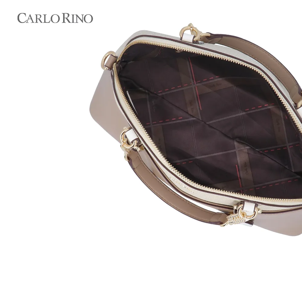 Soft and elegant, this rounded tote is crafted from synthetic leather in a chic beige and tan duo-tone finish. Designed with a half chain strap and hangtag detailing, it adds a refined touch to everyday looks.