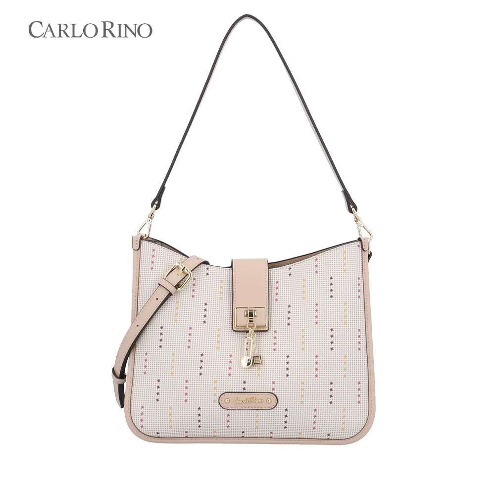 Feminine meets functional with this spacious tote, featuring a front clasp and charming charm detailing. Its playful dotted pattern on coated canvas makes it an instant statement piece.
