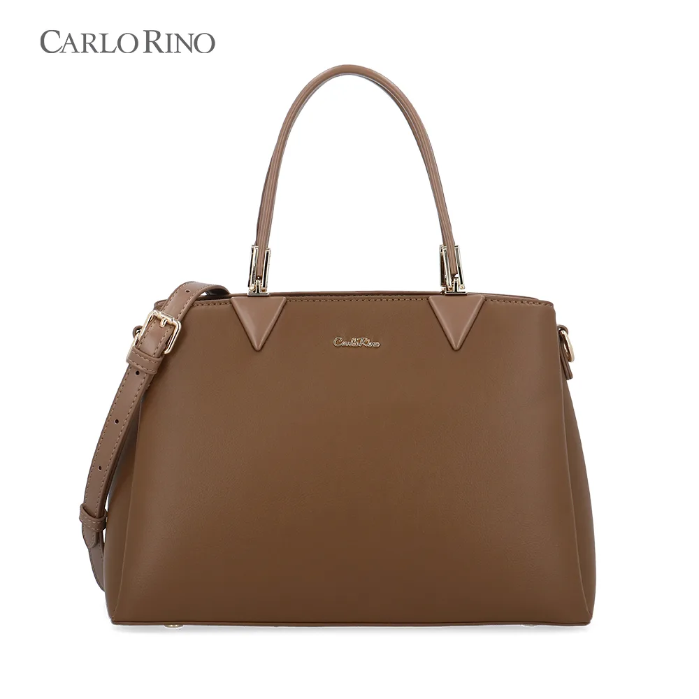 Elegant top handle bag in dark brown synthetic leather. Structured design exudes business-ready style, with a detachable long strap for flexible wear.