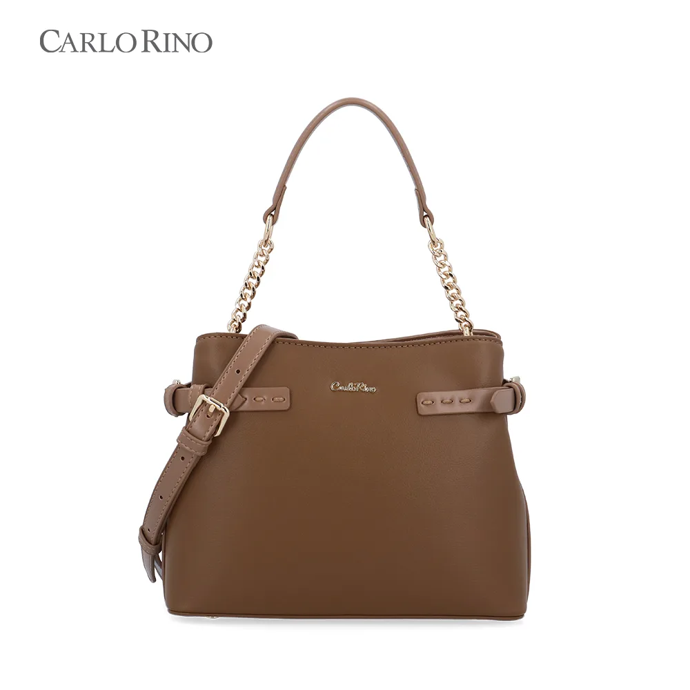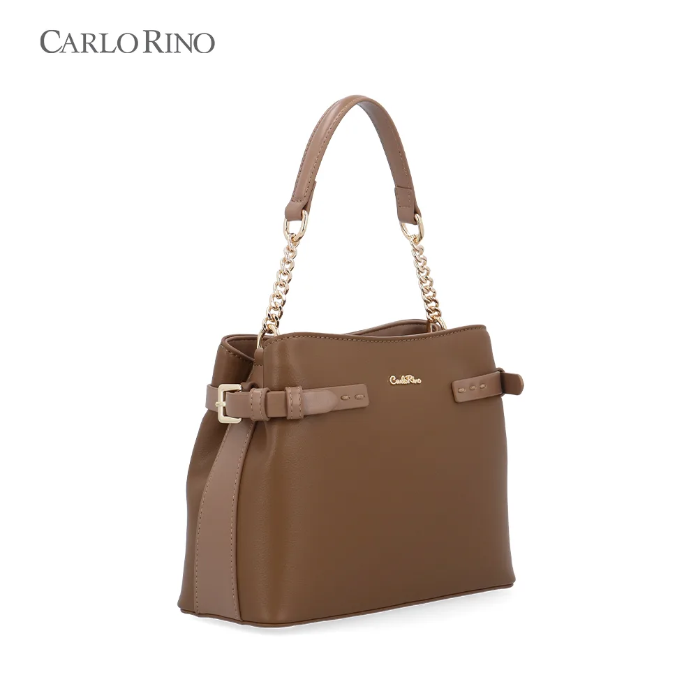 Stylish dark drown synthetic leather top handle bag with buckle detailing and gold accents on the strap. Comes with a detachable long strap for versatile, everyday wear.