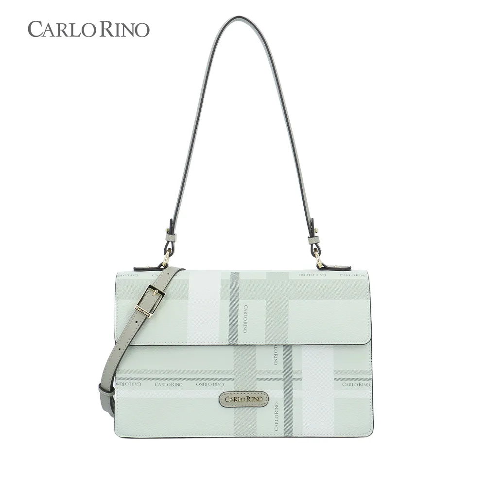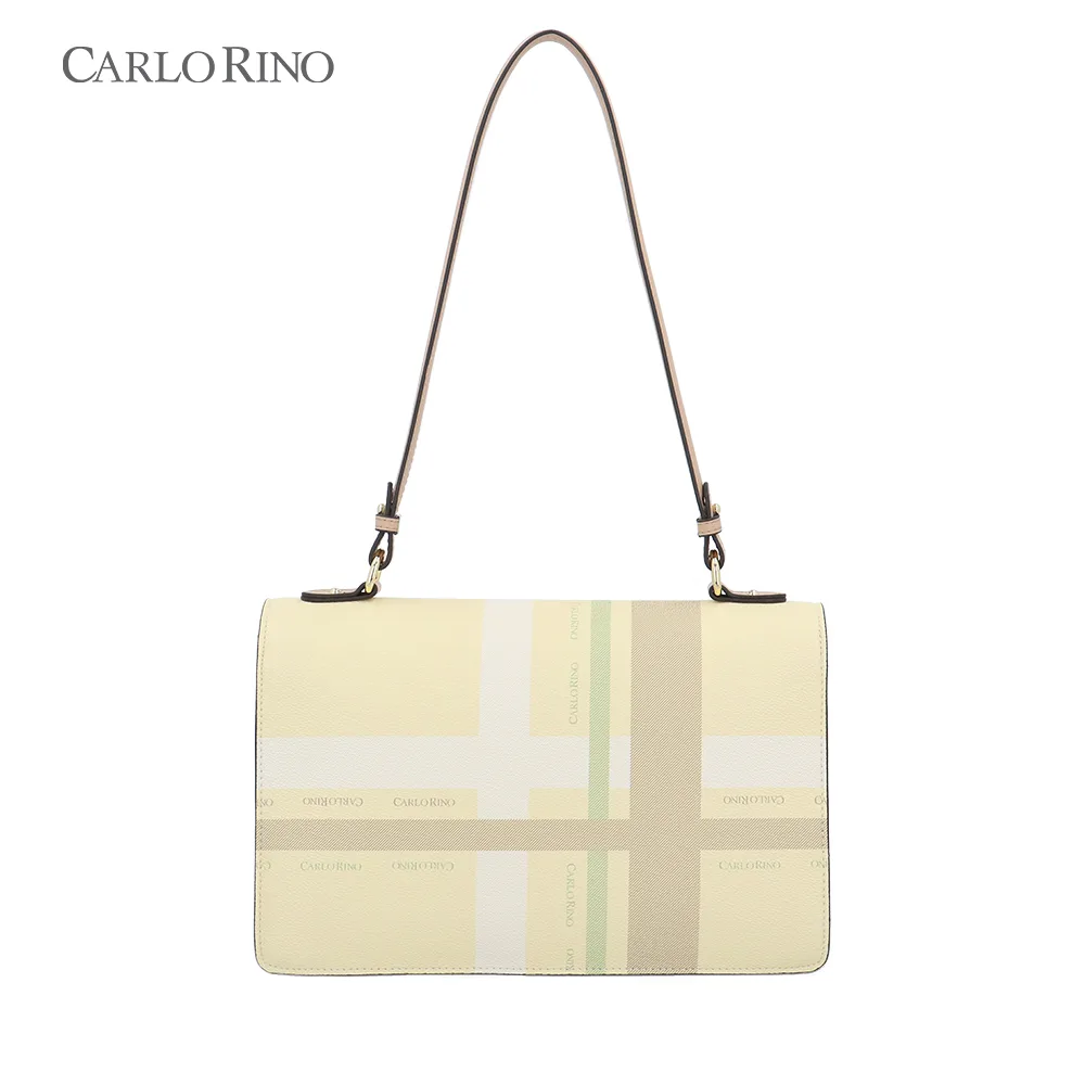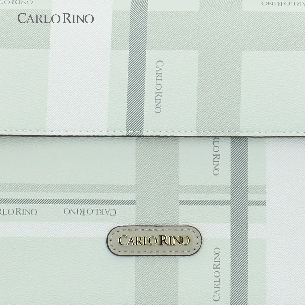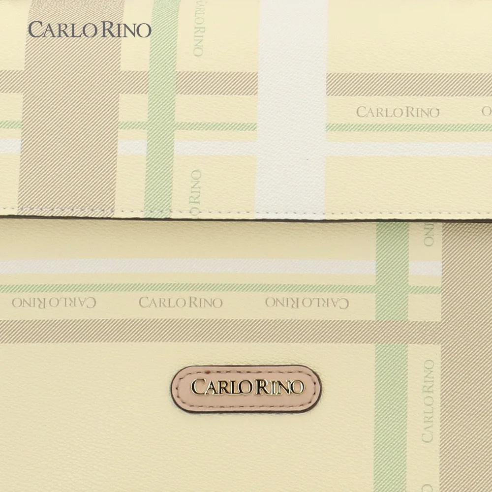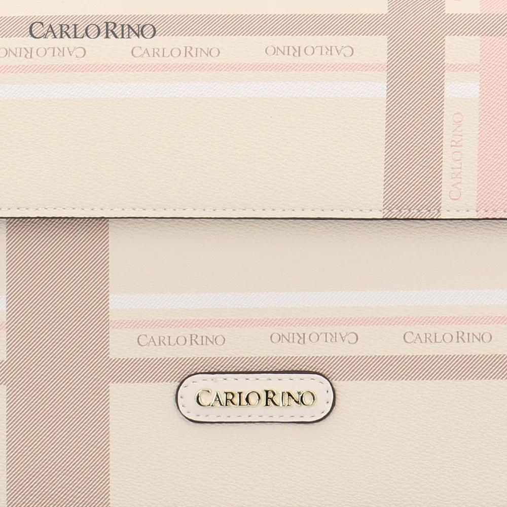 This structured shoulder bag features a pastel checkered print and minimalist Carlo Rino logogram. Made from coated canvas and secured with a magnetic flap closure for a sleek, refined finish.