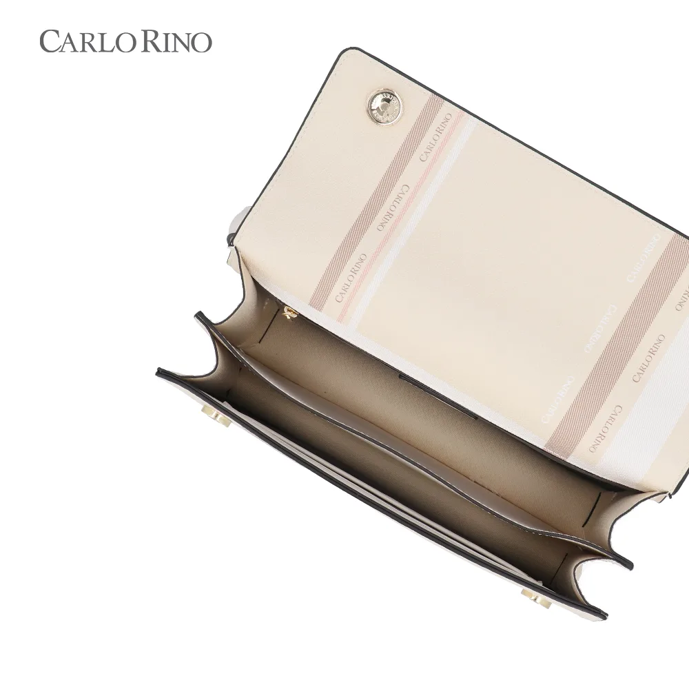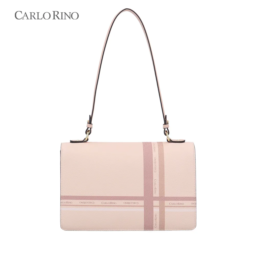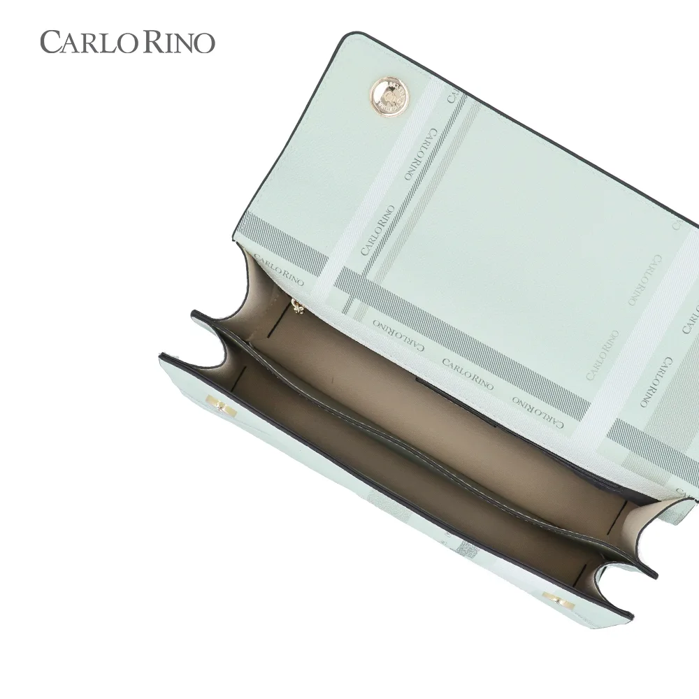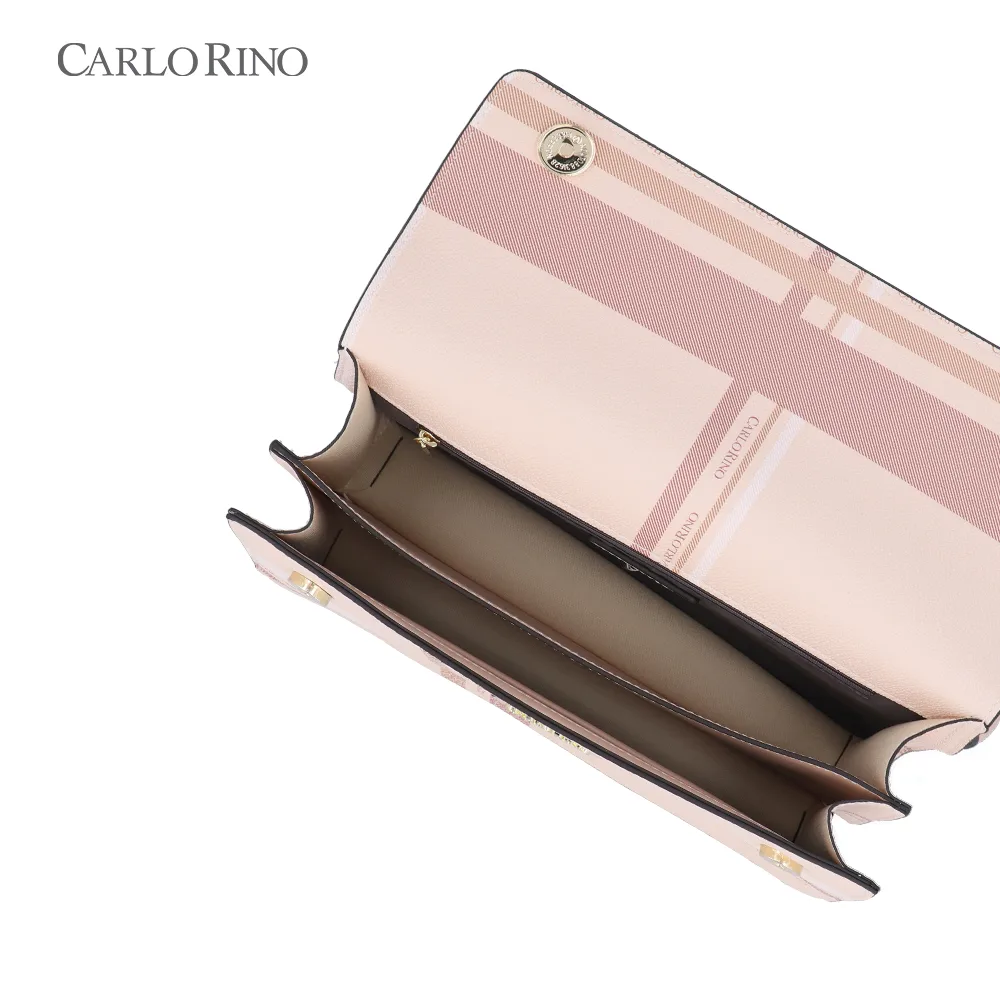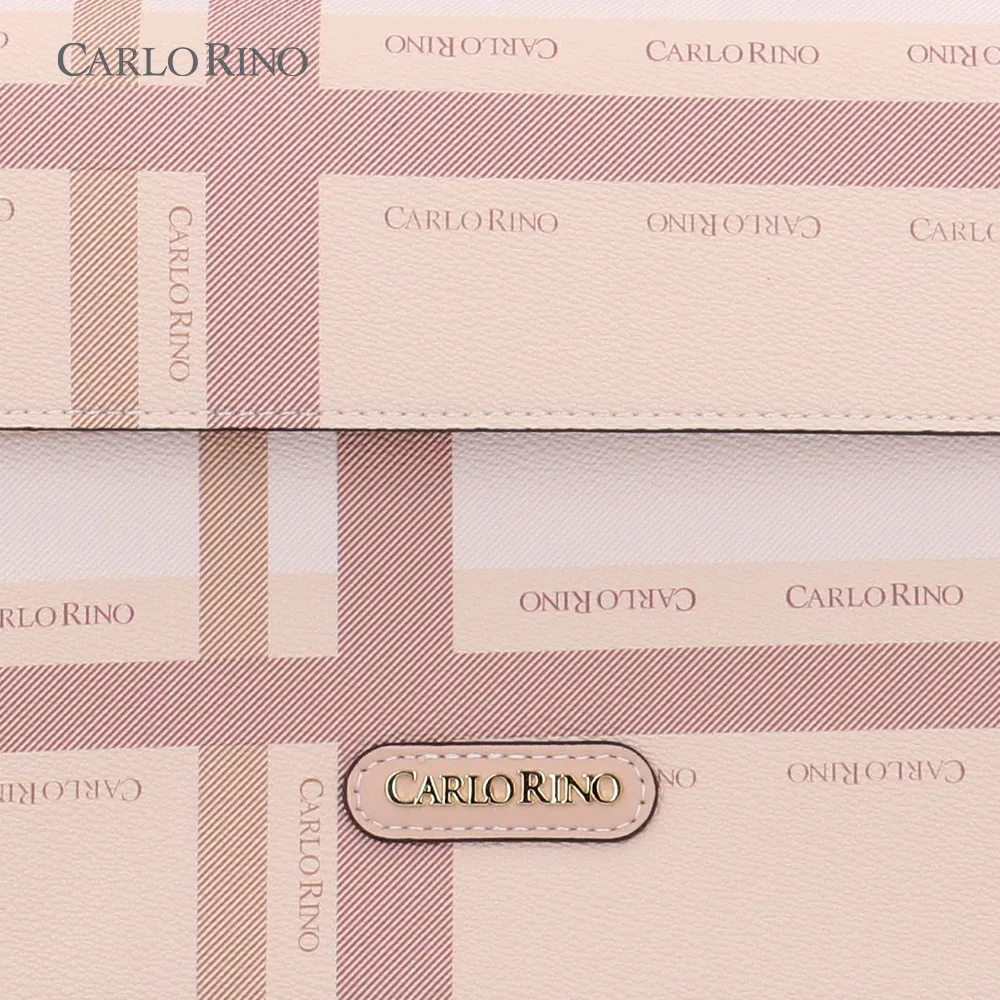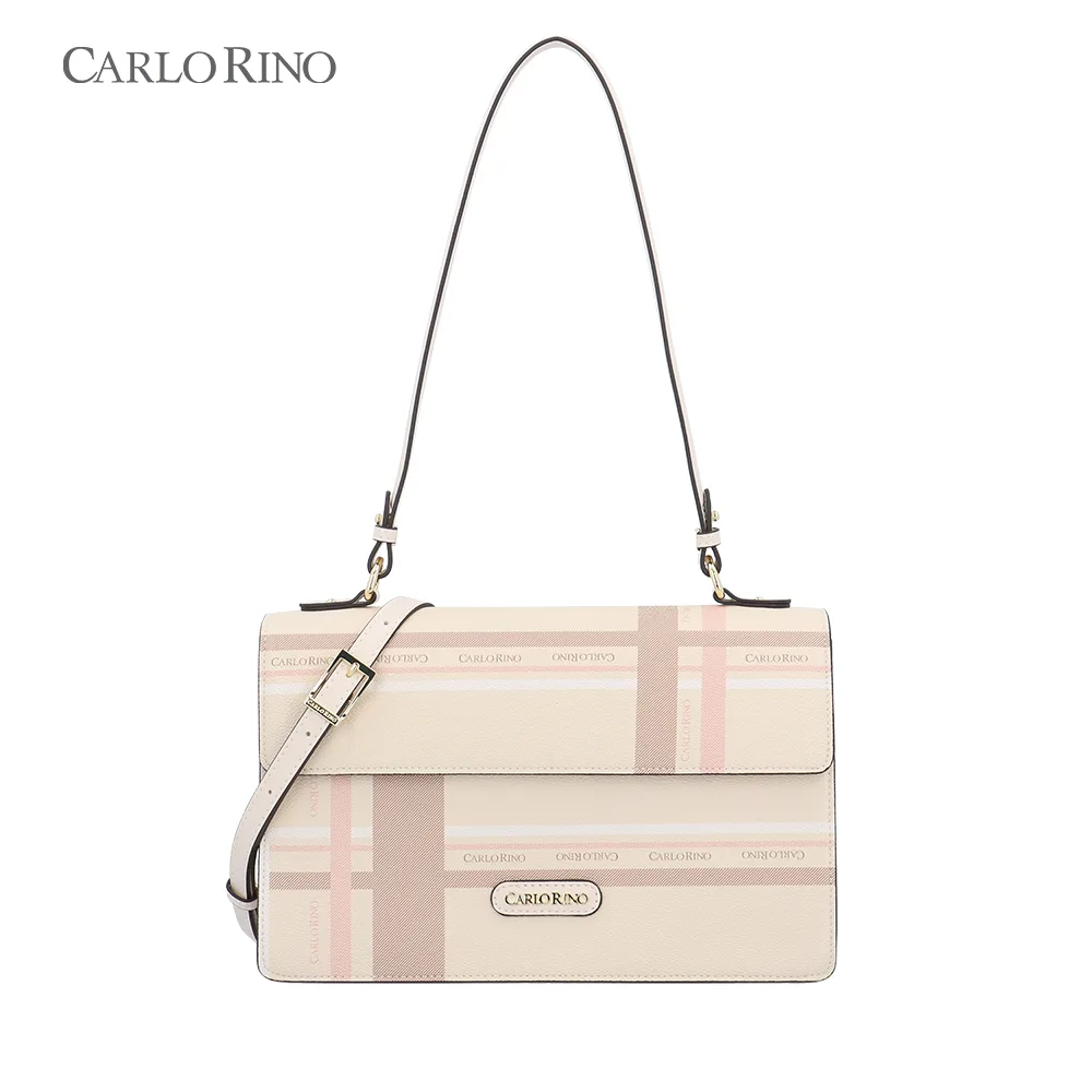 This structured shoulder bag features a pastel checkered print and minimalist Carlo Rino logogram. Made from coated canvas and secured with a magnetic flap closure for a sleek, refined finish.